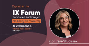 Zapraszamy serdecznie na wystąpienie dr Ireny Skubiszak: „Konsorcjum wykonawcą zamówienia publicznego” podczas IX Forum Zamówień Publicznych dla Kadry Kierowniczej w Gdańsku, które odbędzie się w dniach 26-28 maja.